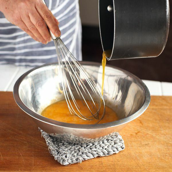 - Die Eigelbe mit dem Zucker schaumig schlagen.